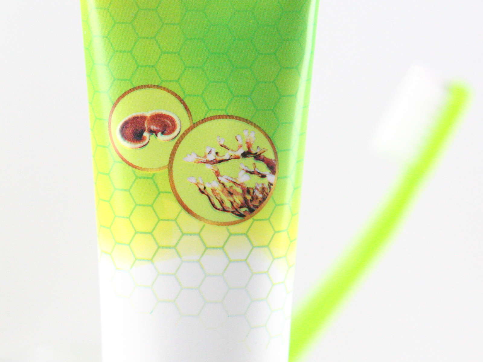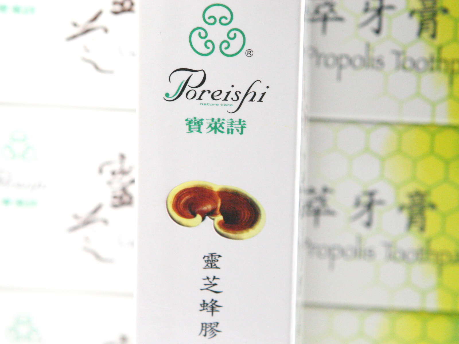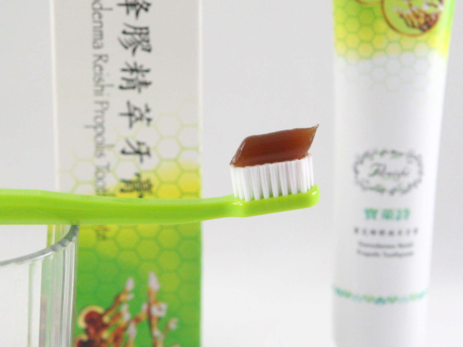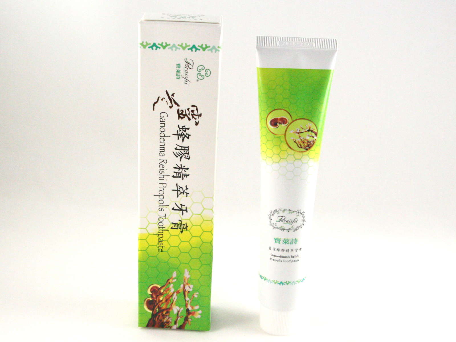 Zubná pasta. Hlavnou zložkou tejto zubnej pasty je výťažok z lesklokôrky a propolis. Čistá hmotnosť náplne: 120 gramov.